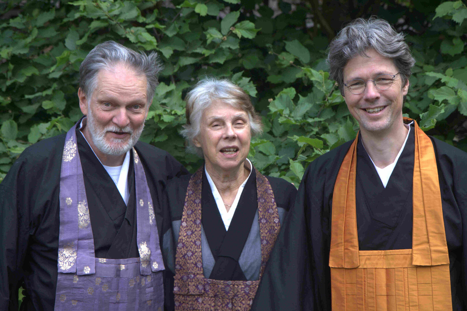 Drie generaties: Michel Oltheten (Plein Ciel) Roshi, Catherine (Genno) Pages Roshi en Jeroen Bosch (Come Closer) Sensei. De foto is gemaakt aan het einde van de Transmissie-sesshin in mei 2025.